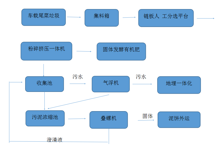 尾菜來料后進入集料箱緩存,然后經(jīng)底部螺旋輸送至鏈板平臺;鏈板輸送機設計為“Z”型,后端作為人工分選平臺,中間設備自動除鐵器,去除尾菜垃圾中的鐵制品;經(jīng)過分選的尾菜垃圾隨后進入粉碎擠壓一體機進行減量。經(jīng)過擠壓后的固體垃圾進入發(fā)酵倉進行發(fā)酵,用作有機肥;液體進入收集池中緩存。收集池中的液體隨后泵入氣浮機,去除大量懸浮物,氣浮后的浮渣進入疊螺機,污水則進入地埋一體化設備,*后達標排放。
